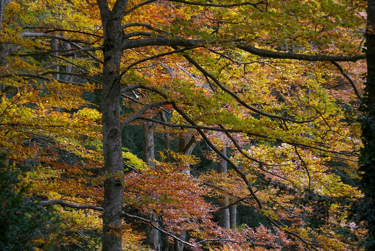 It is precisely this atmosphere that defines La Grevolosa, often described as magical, mystical, or like something out of a fairy tale. Upon entering, the senses sharpen: a profound quietness envelops you, almost a reverential silence , the air carries the intoxicating scent of damp earth and lush vegetation , and the eyes feast on the tapestry of moss covering rocks and trunks beneath the filtered light that barely penetrates the dense foliage. The frequent presence of mist adds a veil of mystery, intensifying its ethereal quality. Here, the comparison with Yakushima and the forests of Mononoke finds its full meaning. The ancient beeches, moss-covered ground, stillness, and potential mist of Grevolosa resonate with the primeval cedar forests (Yakusugi) , the ubiquitous moss , the high humidity, and the spiritual, almost supernatural feeling of Yakushima’s Shiratani Unsuikyo ravine , the direct inspiration for Miyazaki’s film. Both places share that sensation of stepping into an ancient, living, breathing world. Autumn transforms La Grevolosa into a chromatic explosion, with leaves turning yellow, ochre, red, and brown, creating a particularly enchanting spectacle.